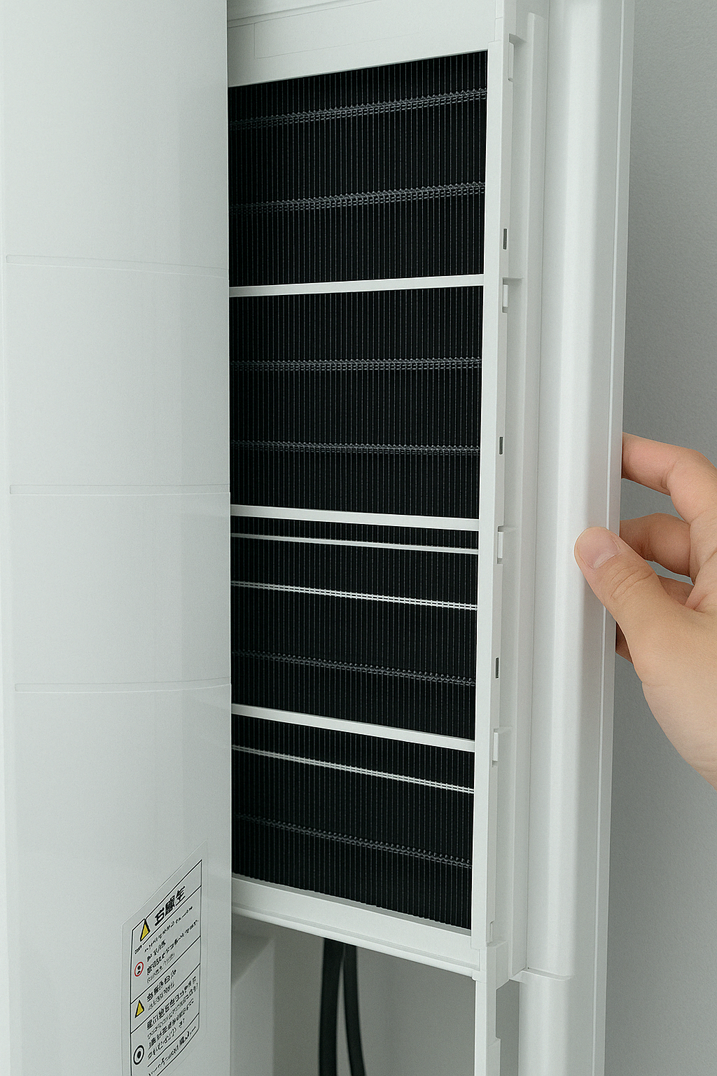 삼성 무풍에어컨의 극세필터는 전면 커버 안쪽에 위치해 있습니다. 대부분의 모델은 손쉽게 커버를 열 수 있도록 하단 양쪽을 잡고 위로 살짝 들어 올리는 방식입니다.